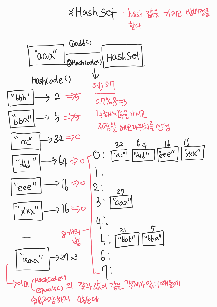 HashSet (= 해시값을 가지고 방 배정을 한다)은 내부적으로 값을 저장할 때 위치 정보를 순서대로 저장하지 않는다.